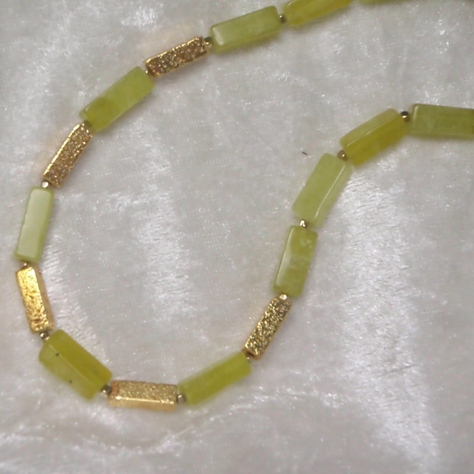 Natural peridot rectangle beads paired with gold-coloured hematite rectangle accent beads create a classic yet striking necklace that catches the light beautifully and feels elegant. Matching earrings are also available for purchase to complete your look.