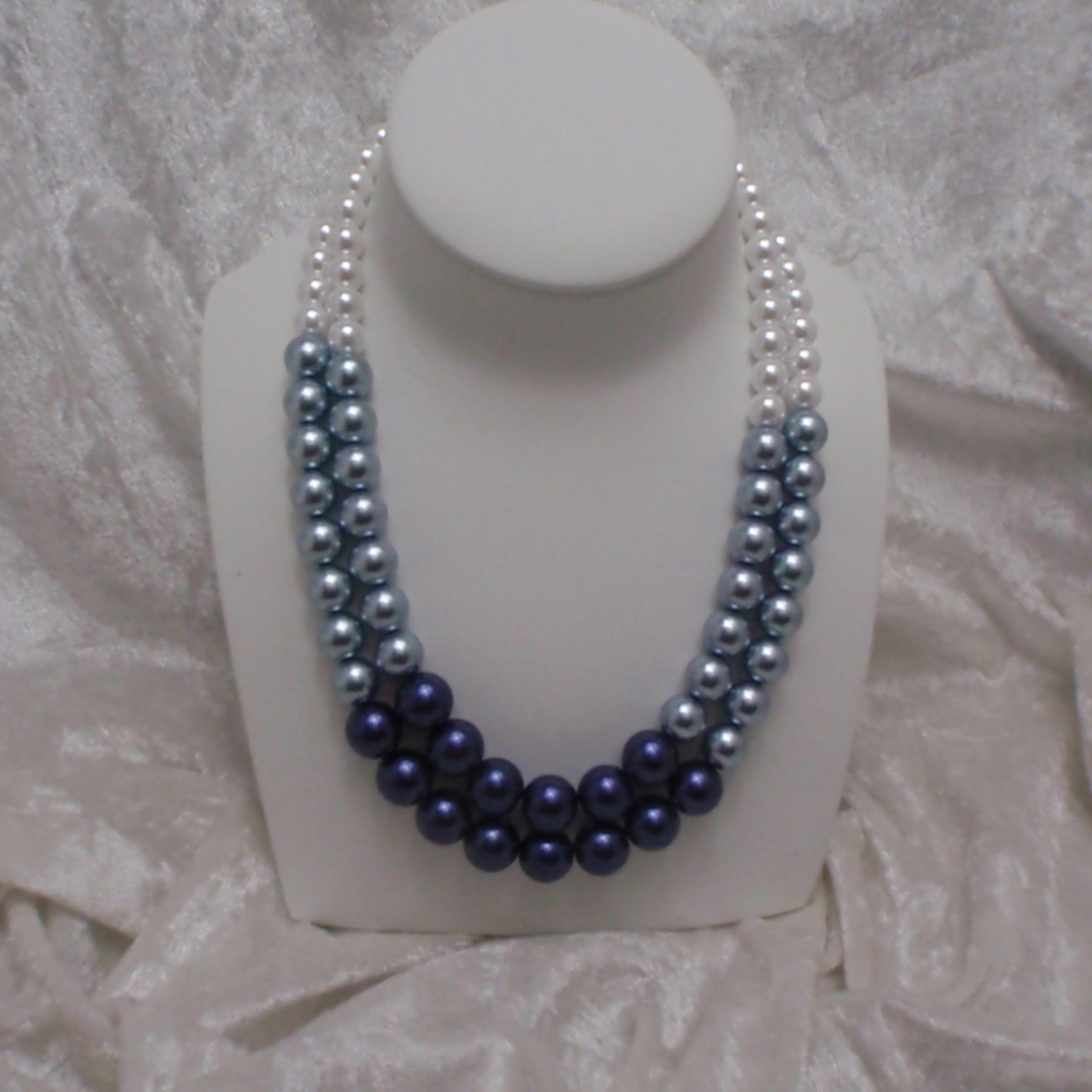 Twin-strand faux pearl necklace featuring graduated bead sizes and three distinct colours, secured with a round magnetic clasp. Matching bracelet and dangle earrings available.
