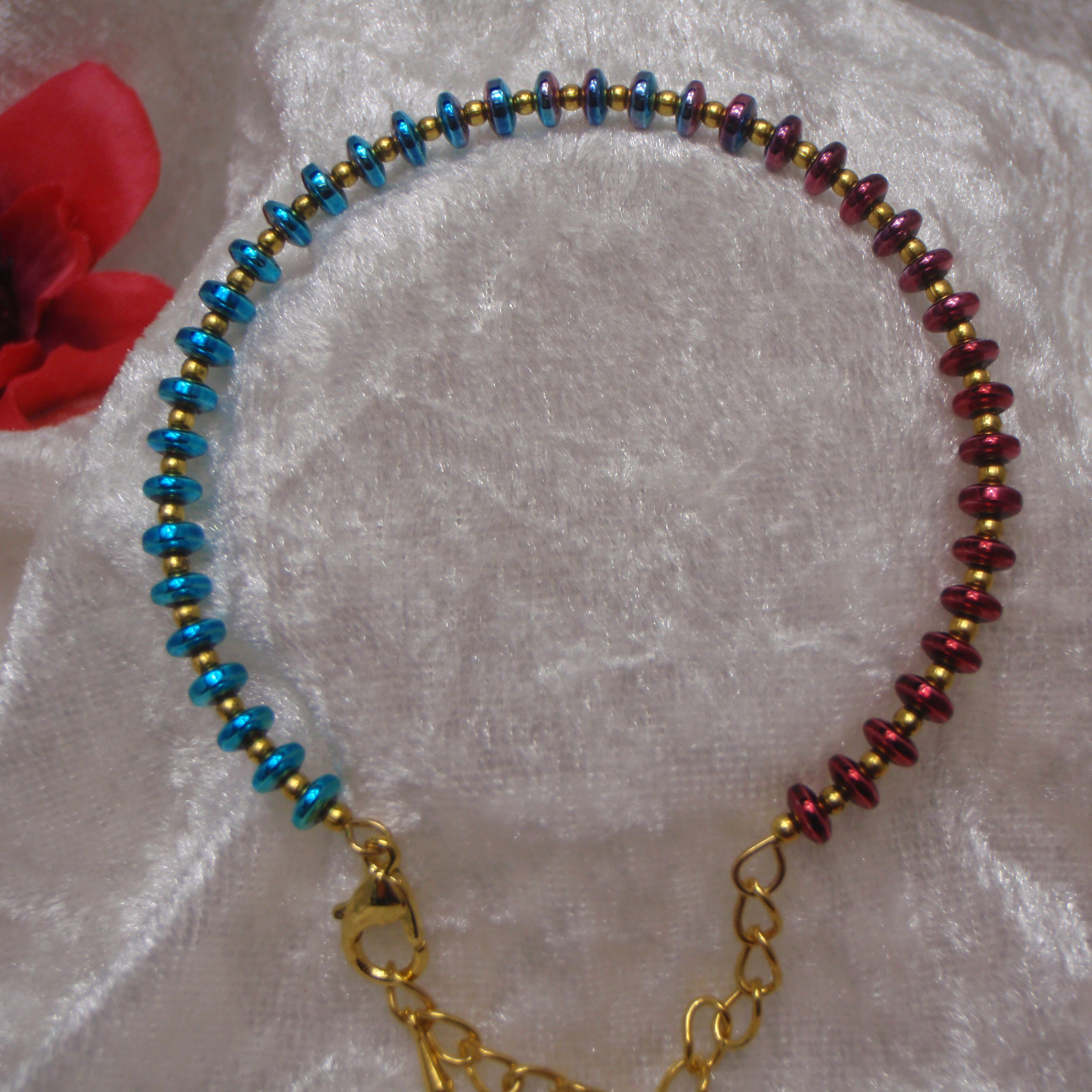 This exquisite luxury bracelet features a radiant gold‑coloured clasp with an adjustable extension chain, offering both elegance and a comfortable fit. Designed with striking rainbow‑coloured hematite rondel beads, each piece is beautifully accented by delicate gold‑coloured metal beads that catch the light with subtle sophistication. The harmonious blend of colour and metallic detail creates a refined statement accessory, perfect for elevating both day and evening looks. For a coordinated and polished finish, a matching necklace is also available to complete the set.