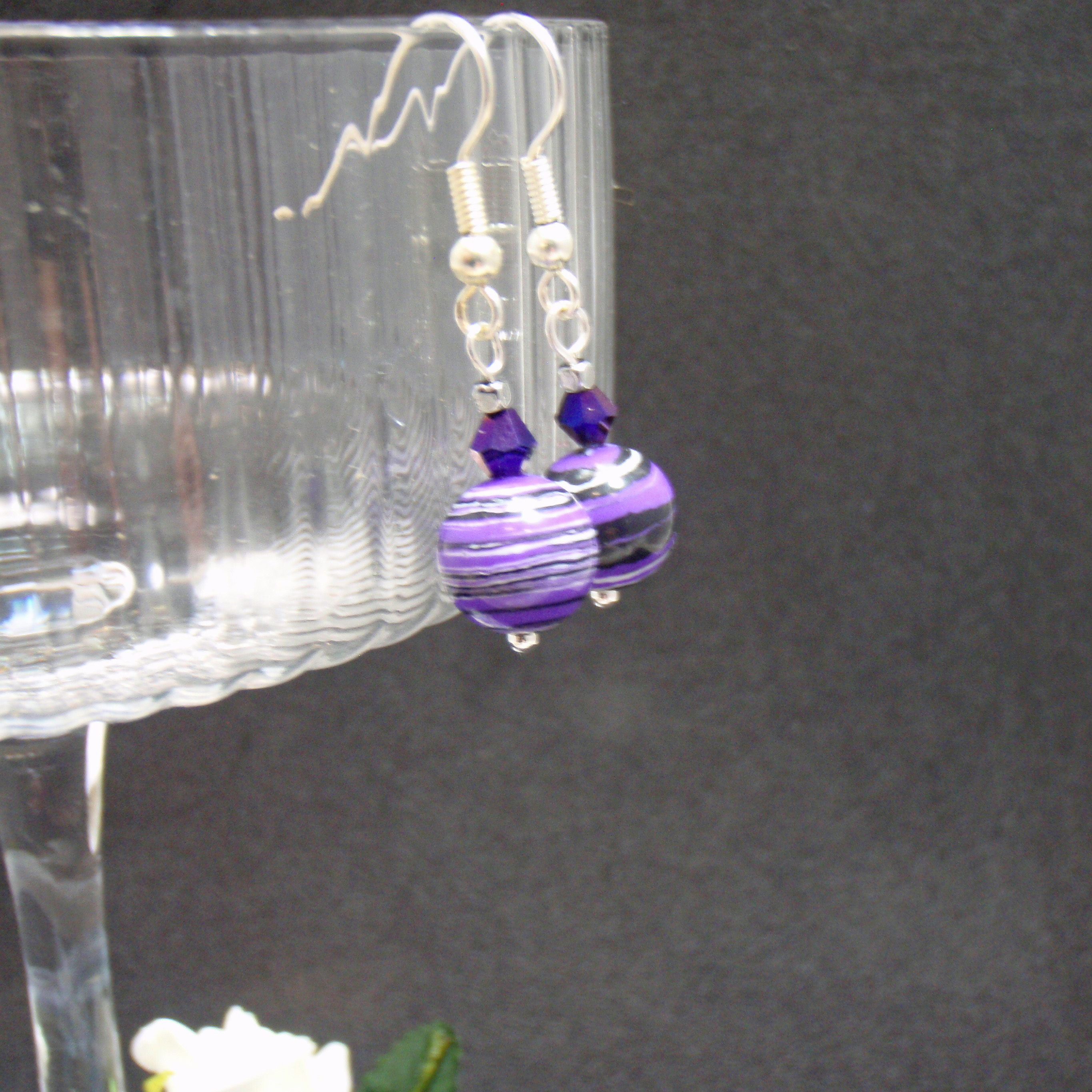 Elegant handmade earrings featuring purple and white banded calsilica round beads, faceted glass bi cone beads, and subtle hematite accents, finished with silver coloured fishhook style ear wires for a refined, lightweight sparkle.